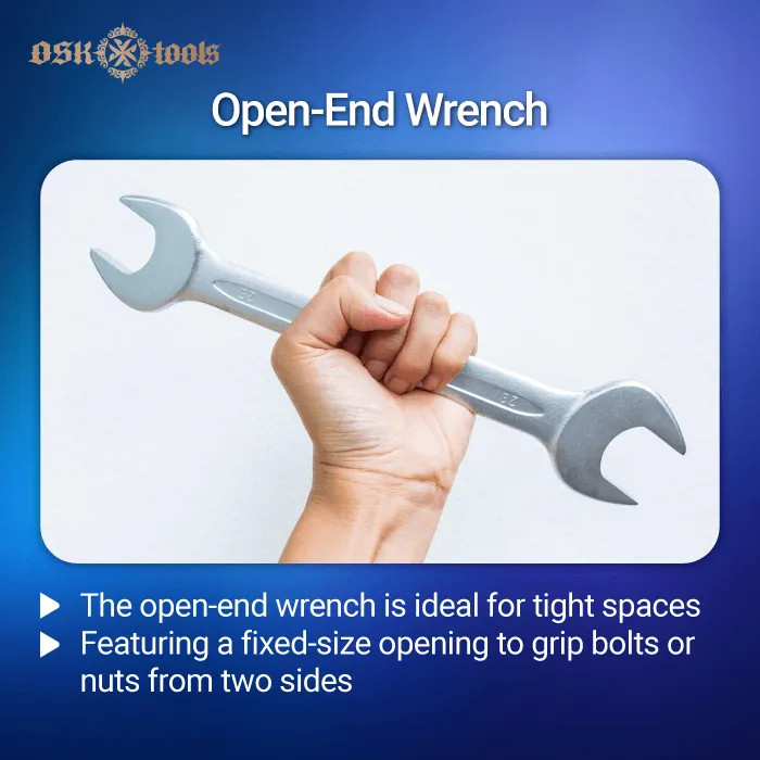 An open-end wrench is a fixed-size tool with a single or double open-ended design, used for gripping hexagonal or square bolts and nuts. Its open structure allows for use in tight or confined spaces, making it especially useful for tasks that require frequent angle adjustments. Compared to a box-end wrench, an open-end wrench allows for quicker engagement and removal but has less contact area, requiring careful force application to prevent bolt slippage or damage. This type of wrench is commonly used for basic repairs, fastening, and loosening lightweight bolts, making it an essential entry-level tool for beginner mechanics.